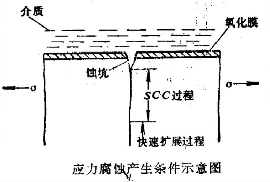 Cl-在坑点或缝隙处聚集,在应力造成的晶格破坏协助下,渗入到金属基体,通过电化学的阳极过程形成穿晶腐蚀或晶间腐蚀,阴极则由氢离子(酸性溶液)或溶解氧(中性水溶液)担任。